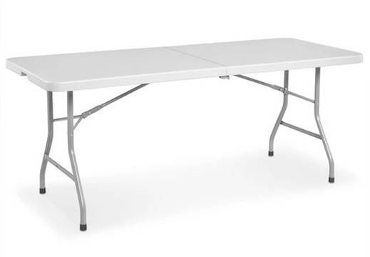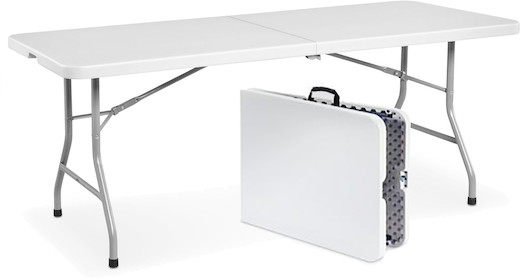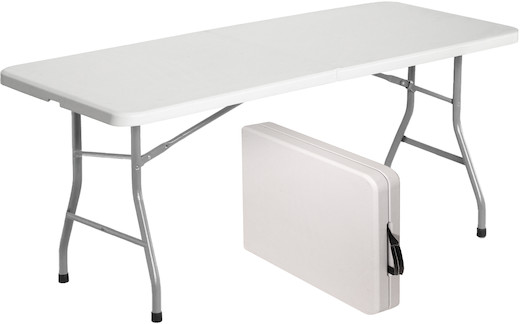 Tables! The White 72 × 30″ Table – 2 pack is a set of two durable rectangular tables that fold in half so that they’re each just 4 inches thick, making for easy storage and transportation.