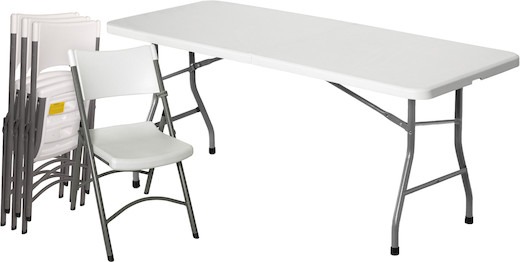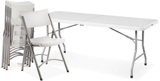 The White 72 × 30″ Table and Chairs – 5 Piece Set is a package that includes one 72 × 30” folding table and four folding chairs. It’s great to have on hand for shoots, screenings, live performances, meetings, and, you know, any of the myriad reasons you might want to have extra tables and chairs around.
