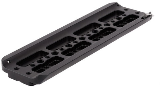 This Wooden Camera 8" Safety Dovetail plate is an ARRI standard plate designed with threaded 1/4"-20 and 3/8"-16 holes. Key features include: