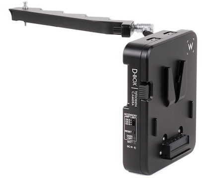 The Wooden Camera D-Box for Sony Venice (V-Mount) adds power distribution to a Sony VENICE with 3-pin Fischer, 2-pin LEMO, d-tap, & USB outputs while passing power through to a V-Mount battery plate. Key features include: