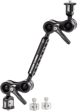 The Wooden Universal Ultra Arm Monitor Mount 5-inch is a versatile and easy to use articulating arm with swappable 3/8-16 and 1/4-20 tightening knobs, two sets of 25mm double ball joints, and a 5" center extension. Key features include: