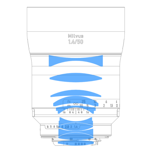 High-Quality Build. The Zeiss Milvus ZE 50mm f/1.4 for Canon features a weather-resistant construction with internal seals to guard against dust and moisture, while a blue sealing ring at the lens mount protects the lens-camera interface. The all-metal lens barrel has a frosted, anodized surface for increased durability.